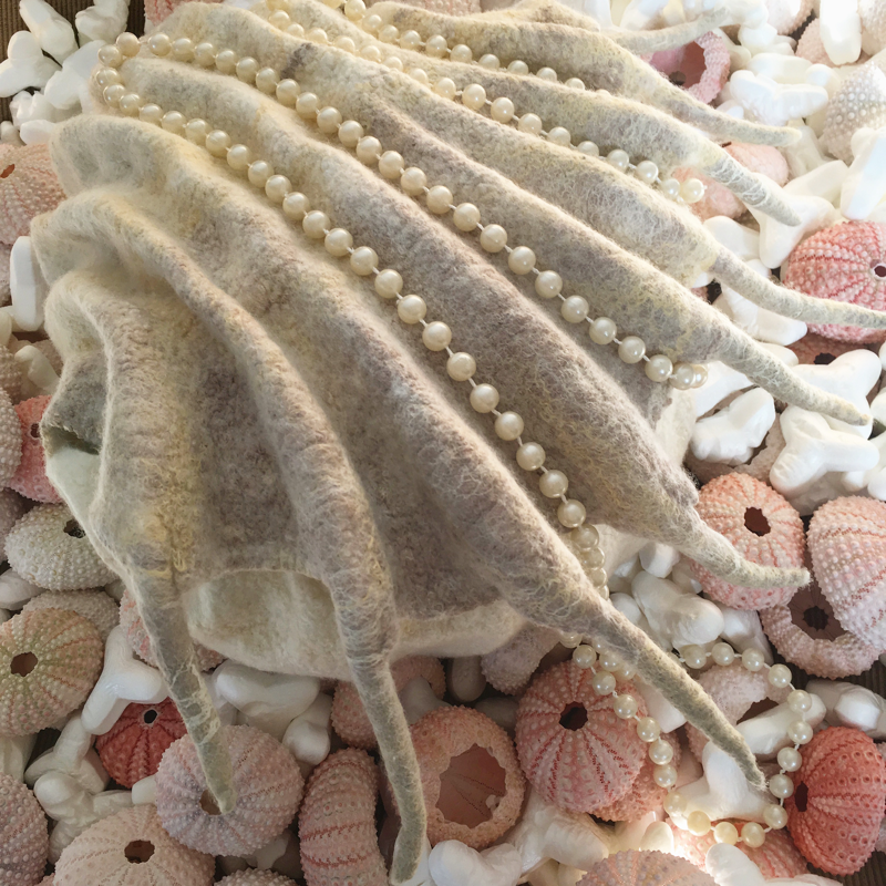 Das ist eine handgefilzte Muschel aus feinster Merinowolle, Seide und Milchfasern, die perfekt zum maritimen Style der Einrichtung passt und zur Aufbewahrung von Kleinigkeiten dient.